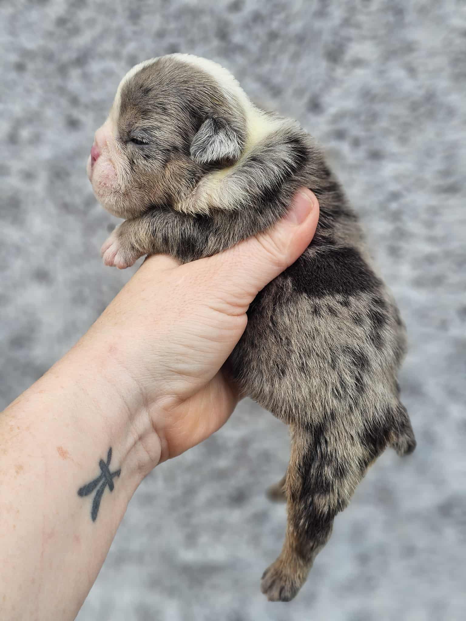 Charlotte is a mini English bulldog that’s a blue and tan merle she’s 2.5 weeks old and will be ready for her new home at 4-6 weeks all shots records will be included with delivery